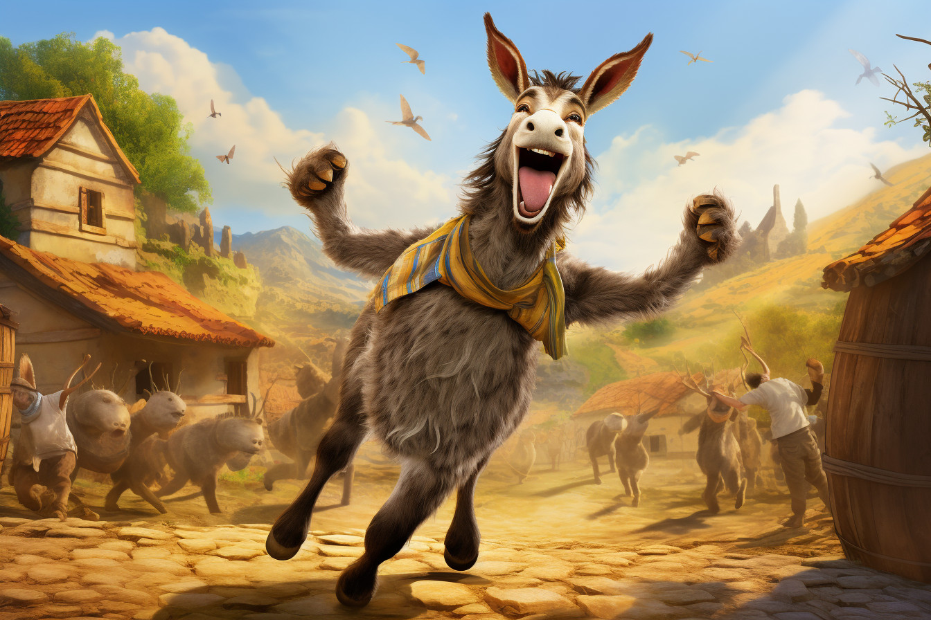 А в соседней деревне жил упрямый ослик по имени Стабби. Его шерсть была взъерошена, а уши торчали, как два весёлых флажка. Ослик таскал ведра с водой, возил телеги, но больше всего любил петь песни и танцевать.